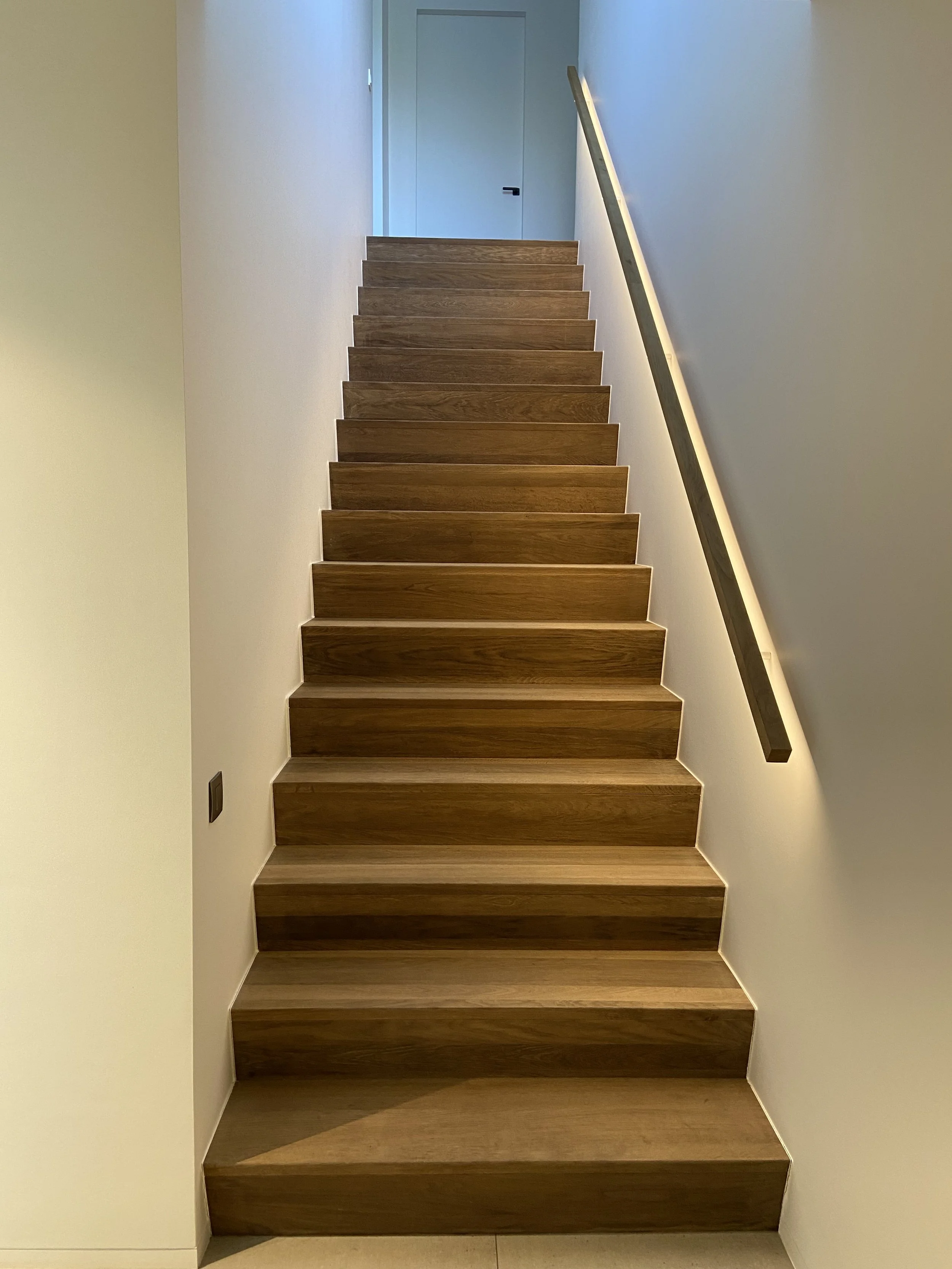 Niet elk project vraagt om kunst of decoratie als blikvanger. Soms is het meer aangeraden om een architecturaal element in de verf te zetten: een bijzondere trap, een nis in de muur of een originele plafondvorm. Zo transformeerde ik in het project ‘Zeebries’ een anonieme inkomhal door een op maat gemaakte houten trapleuning te integreren. Dit subtiele maar uitgesproken element trekt onmiddellijk de aandacht en geeft de ruimte een eigen identiteit.